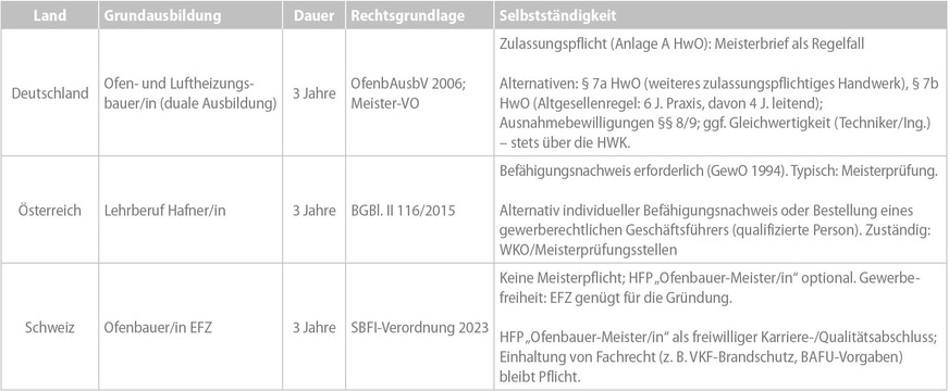 Während in Deutschland das Ofen- und Luftheizungsbauer-Handwerk weiterhin ein zulassungspflichtiges Handwerk ist – der klassische Weg führt hier über den Meister –, kennen die Schweizer keine Meisterpflicht. Nach der dreijährigen Grundbildung„Ofenbauer/in EFZ“ ist eine Firmengründung grundsätzlich möglich. In Österreich wiederum braucht es für den Gewerbeantritt einen Befähigungsnachweis, der typischerweise über die Meisterprüfung erbracht wird – alternativ sind aber auch gleichwertige Nachweise oder ein gewerberechtlicher Geschäftsführer möglich. Diese Unterschiede prägen Karrierewege, Betriebsnachfolge und die Gewinnung von Nachwuchs – und sollten beim betrieblichen Recruiting, bei Kooperationen über die Grenze sowie bei Familienbetrieben mit Standorten in mehreren Ländern unbedingt mitgedacht werden.