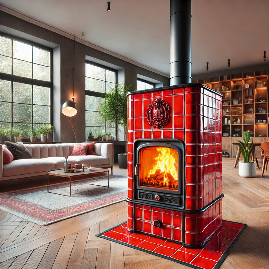 Dieses Bild eines roten Kachelofens wurde mit dem in ChatGPT integrierten Programm DALL-E erstellt. Durch einen relativ einfachen Prompt: „Ich wünsche ein Bild von einem Kachelofen mit roter Keramik in einem modernen Wohnumfeld“ kann das Ergebnis noch nicht wirklich überzeugen.