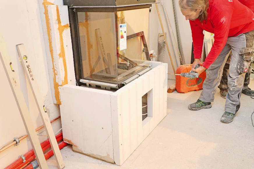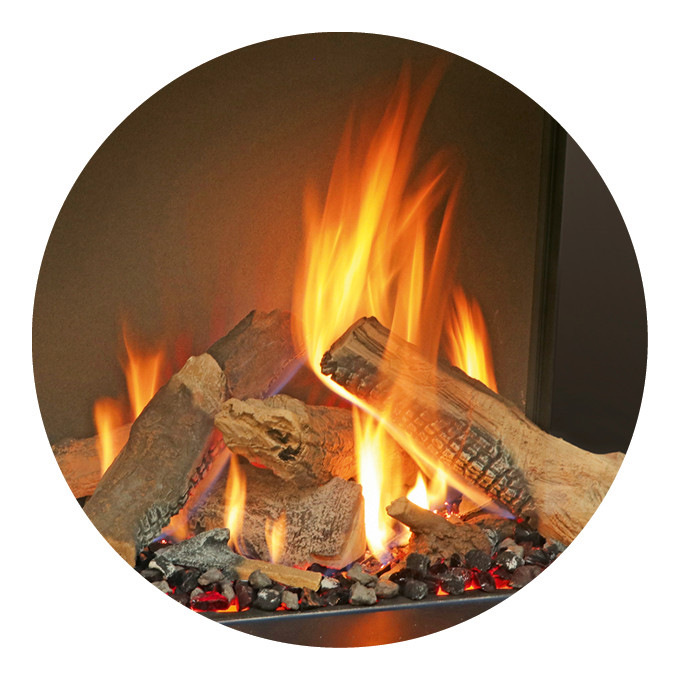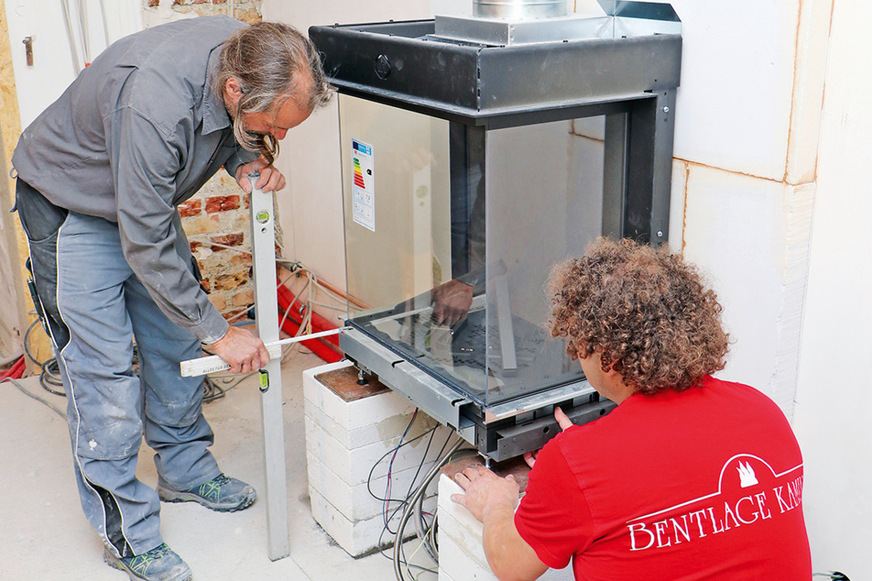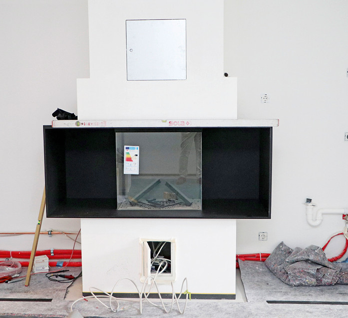 Die Wahl für einen modernen, erdgasbetriebenen Kamin fiel leicht. Denn einerseits wollte die Eigentümerin keinesfalls den Blick auf echtes Feuer missen, andererseits sich aber auch den Mehraufwand für einen holzbefeuerten Ofen, angefangen vom Holzkauf und -transport über -hacken und -lagerung bis hin zum deutlich höheren Reinigungsaufwand, ersparen. Zudem verbrennt Gas sauber – ohne Ruß und Asche zu produzieren: Im Vergleich zu Holz entsteht beim Verbrennen von Gas bei gleichem Primärenergieeinsatz nur ein Bruchteil von Feinstaubemissionen (Brennholz: 100 mg/MJ, Gas: 0,1 mg/MJ). Und auch bei der CO₂-Bilanz ist Gas die umweltfreundlichere Alternative. Das alles entscheidende Kriterium für die Gasvariante war aber dann doch „Kaminfeuer auf Knopfdruck“. Moderne Geräte lassen sich mit einer mitgelieferten Fernbedienung bequem vom Sofa aus oder, wenn gewünscht, auch via App ein- und ausschalten. Hochwertige Ausführungen produzieren durch unterschiedlich wählbare Flammenbild- Szenarien in Verbindung mit einer ansprechenden Brennraum-Deko sogar Kaminfeuereffekte, inklusive lodernder Flamme und Glutbild, und sind damit durchaus vergleichbar mit holzbefeuerten Kaminen. Dazu tragen nicht zuletzt verblüffend echt aussehende, handbemalte Scheitholzimitate aus hochtemperaturbeständiger Faserkeramik bei. Doch damit nicht genug: Klein gemahlene, gefärbte und auf den Brenner gestreute Vermiculite (Mineral), schwarze und graue auf die Metalloberfläche um den Brenner herum angeordnete Chips und schließlich nach Anleitung geschickt um die Scheitholzimitate verlegte, engelshaardünne Glühwolle aus Bestandteilen des Wolframdrahtes überzeugen regelmäßig selbst Skeptiker, die bislang der Ansicht waren, dass ein faszinierendes Flammenspiel nur mit „echtem Holz“ erzeugt werden kann.
