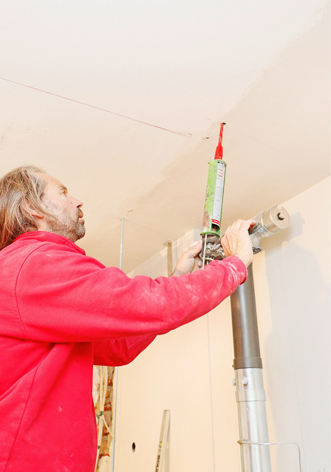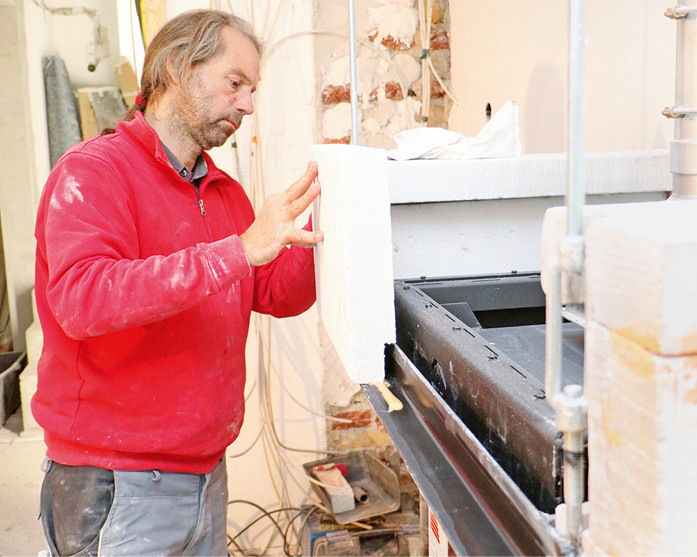 Feuer braucht Luft. Und Rauchgase müssen zuverlässig nach draußen. Um das sicherzustellen, installierte der Ofensetzerbetrieb direkt unterm Dach in den Abluftkanal ein vom Hersteller des Gaskamins speziell für längere Abgasleitungen entwickeltes, motorisiertes Abluftsystem („PowerVent“), das permanent Luftdruck und -fluss im Abluftkanal kontrolliert, bedarfsgerecht regelt und so stets für einen optimal brennenden Gaskamin sorgt. Der Clou: Mit dieser vollautomatisch arbeitenden, elektrischen Gebläselösung lassen sich Gaskamine auch ohne klassischen Schornstein nahezu an jedem Aufstellort betreiben. Selbst eine Führung des Abluftsystems nach unten durch den Keller stellt kein Problem dar.