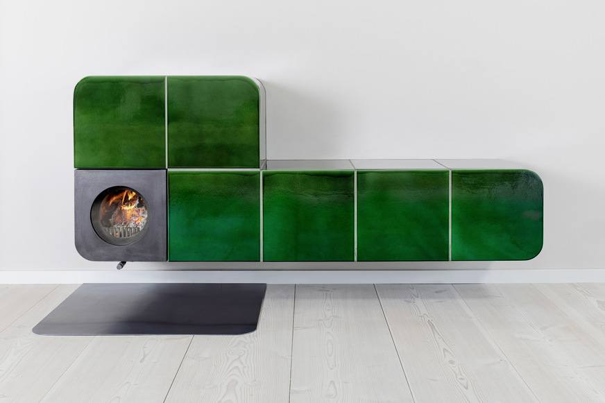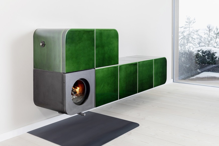 Bei „Kyubu“ handelt es sich um eine wärmende Wandskulptur, die vorzüglich zum modernen Wohnambiente passt. Die klassische Glasur „flaschengrün“ der in Einzelanfertigung hergestellten Manufaktur-kacheln verbindet Tradition und eine zeitlose Eleganz. Der als wandhängender Speicherofen konzipierte Solitär bietet eine Wärmeabgabe von 12–16 Stunden.