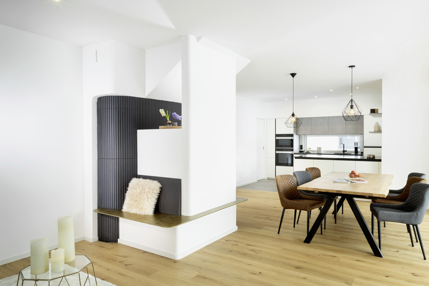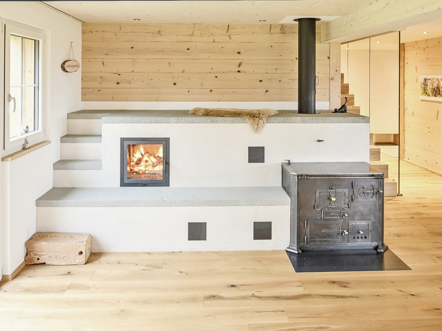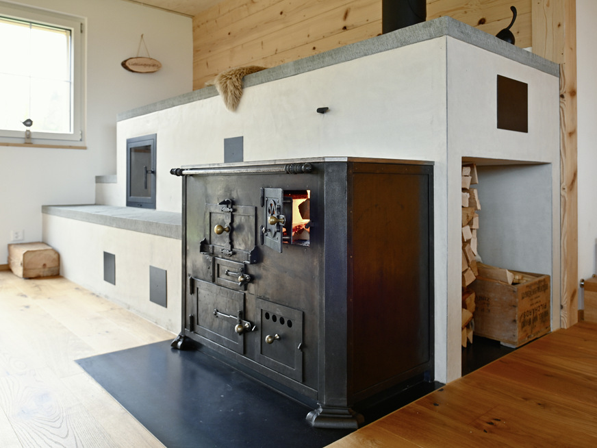 Der restaurierte Holzkochherd fungiert als Bindeglied zur Küche im offenen Wohn-, Koch- und Essbereich und kann wahlweise auch die Ofenbank beheizen.