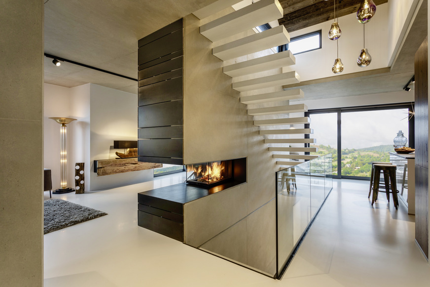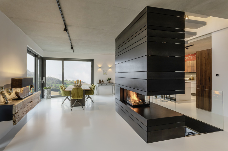 Dieses Feuermöbel besticht in erster Linie durch die Einbindung in die Architektur des extravaganten Hauses. Perfekt eingespannt in eine 24 Zentimeter dicke Sichtbetonwand ist das lodernde Flammenbild selbst in der Küche noch zu sehen. Von der Wohnzimmerseite aus dominieren die 8 Millimeter starken Stahllamellen die Optik.