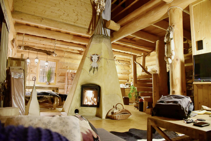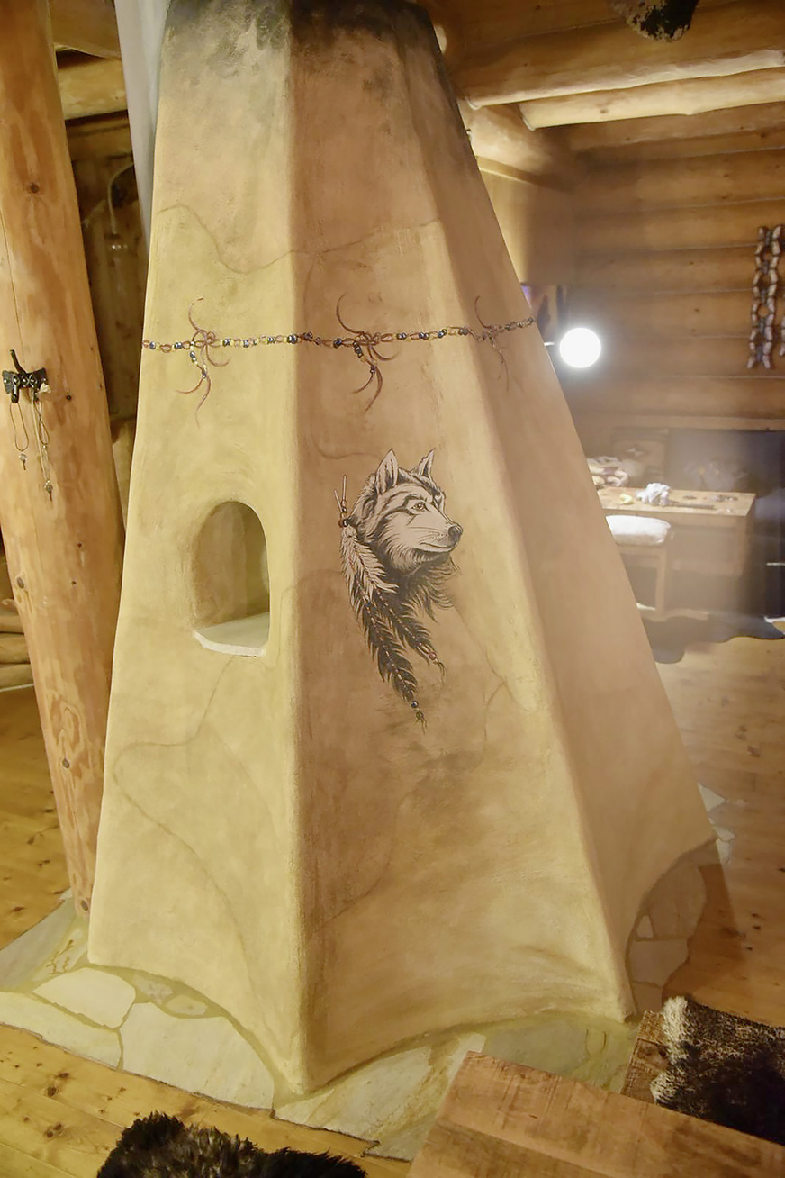 Das gestalterisch extrem auffallende „Tipi“-Modell ist technisch als Grundofen umgesetzt worden. Die handwerklich erstellten keramischen Züge bestehen aus Schamottematerialien. Zusätzlich wurde noch ein auch formal passendes Warmhaltefach integriert. Besonders erwähnenswert – außer der ungewöhnlichen Gestalt dieses Unikats – sind die Tierzeichnungen, die als Akzente die Oberfläche des Ofens zieren.