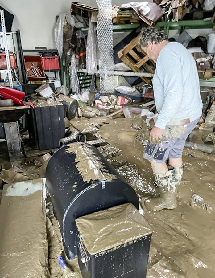 Den Abend und die Nacht vom 14. auf den 15. Juni 2021 werden Michael Baklarz und seine Frau nie vergessen. Zuerst stand nämlich deren Privathaus unter Wasser, und beide hatten schon dort die ganze Nacht über alle Hände voll mit Schadensbegrenzung zu tun. „Am 15. Juni war ich dann wieder im Laden“, so Baklarz, wo der nächste Schock auf ihn wartete: „Das Wasser der Ahr war zwischenzeitlich schon wieder zurückgegangen, aber die Höchstmarke in meinem Geschäft lag bei 3,20 Meter, sprich: das Erdgeschoss und auch noch ein Teil darüber waren voll geflutet. Wir haben dann gleich alles ausgeräumt und auf Container geladen, denn zu gebrauchen war nichts mehr. Die Flutbrühe war schließlich kein sauberes Wasser, sondern ein Gemisch aus braunem Schlamm, der auch mit Fäkalien kontaminiert war und dazu vermischt mit Öl aus übergelaufenen Heizöltanks und aus Autos. Man muss dazu sagen, dass mein Geschäft im Nebengebäude einer Tankstelle liegt. Es stank bestialisch! Nicht nur die Öfen in der Ausstellung waren dadurch ein Totalverlust, auch der gesamte Inhalt des Lagers, zu dem verderbliche Baustoffe wie Mörtel etc. zählten, waren nicht mehr zu gebrauchen. Wir mussten definitiv alles wegschmeißen.“ Zwei Tage hat Michael Baklarz nur Schlamm geschaufelt, der mit selbst organisierten und bezahlten Radladern abgefahren wurde. Zum Glück halfen ihm auch viele Freiwillige vor Ort. „Während der Aufräumphase hatten wir keinen Strom, kein Wasser, nichts. Strom ist übrigens auch erst seit vier Wochen wieder geschaltet“, sagt Baklarz.