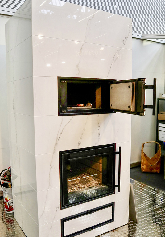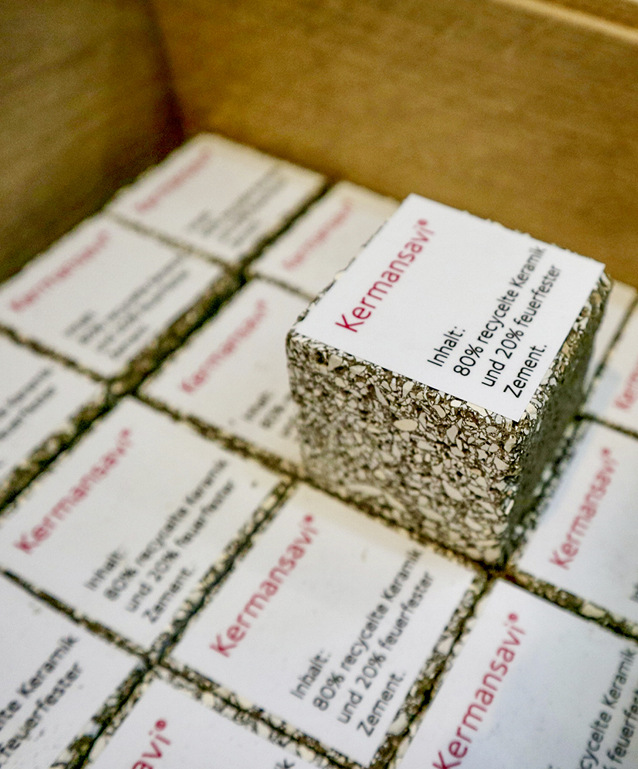 Mit einem besonders spannenden Produkt wartet das finnische Tulikivi-Tochterunternehmen Kermansavi auf. Seine Speicheröfen bestehen zu 80 Prozent aus klein zerstückelter und mit 20 Prozent feuerfestem Zement zu Formelenenten verbundener Keramik. Bei dieser Keramik handelt es sich ausschließlich um Recyclingmaterial, auch Porzellan zählt dazu. Nachdem die als Systemöfen gelieferten Feuerstätten üblicherweise voll verkleidet werden, hat man auf der Börse einmal einen Ofen ohne die Verkleidung aufgebaut und als Ansichtsmaterial kleine Keramik-Zementwürfel zum Mitnehmen präsentiert.