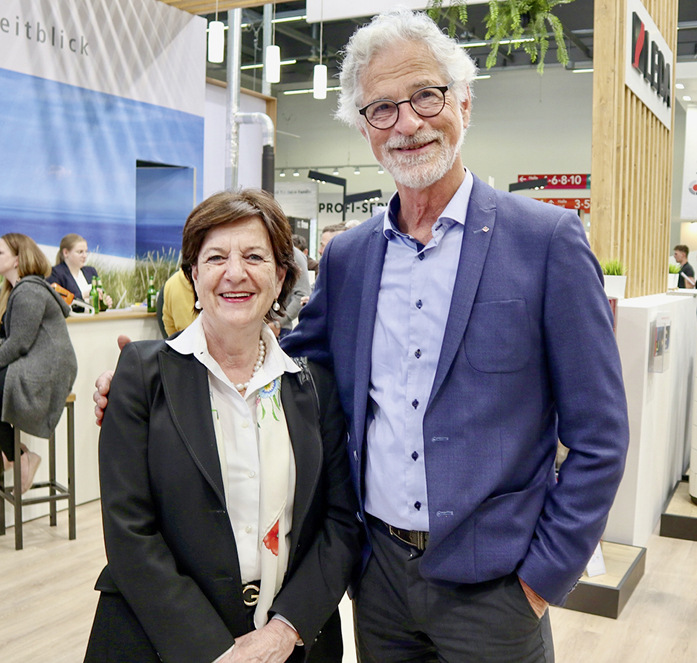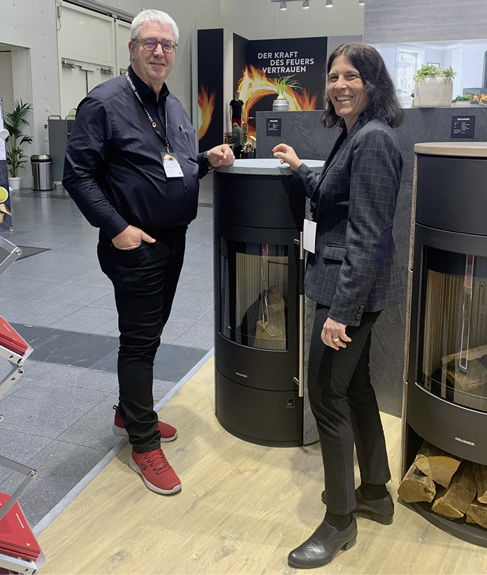 Kaminöfen wie die Dauerbrenner der „Polar Neo“-Baureihe, die auch in wasserführender Version erhältlich sind, waren hier zu sehen. Auch zwei verschiedene Systemkamine vom Typ „Club Tre“ waren ausgestellt. Sie können rücklings wandbündig aufgestellt oder auch frei im Raum positioniert werden. Wie alle Modelle der Heizkamin-Reihe ist auch der „Club Tre“ ein Kamin aus Leichtbeton im Baukastensystem, das eine einfache und schnelle Montage erlaubt. Ein weiterer Vorteil: Die Oberfläche der Betonelemente wird ganz nach Belieben mit handelsüblicher Dispersionsfarbe gestrichen und dem aktuellen Wohnstil angepasst. Ein großes Thema in der Kundenberatung war die auch nach der GEG-Novelle gegebene Förderfähigkeit wasserführender Pelletfeuerstätten. Hier spielt auch das Hybridheizen mit einem weiteren Wärmeerzeuger (meist als Hauptheizquelle) eine Rolle.