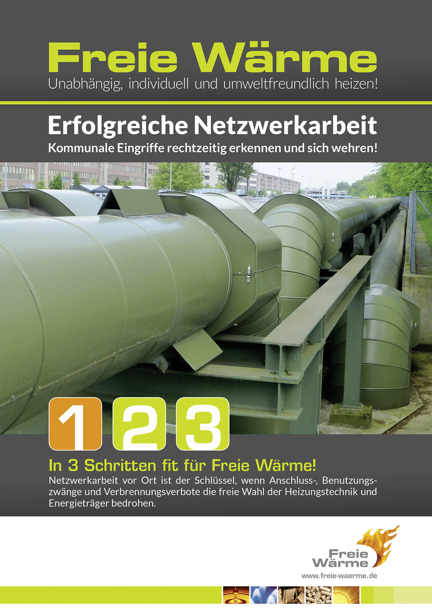 Droht Anschluss-/Benutzungszwang oder ein Verbrennungsverbot durch Nah- und Fernwärme? Wollen Sie sich aktiv gegen monopolistische Wärmenetze und für individuelle Heizungssysteme einsetzen? Diese Broschüre gibt Ihnen als Teilnehmer im individuellen Wärmemarkt praxisnahe Tipps, wie Sie sich zusammen mit Freunden und Partnern im Netzwerk gegen sogenannte kommunale Eingriffe wehren können. Schritt für Schritt mit Arbeitsteilung für kreative Ideen und mit Checkliste. www.freie-waerme.de/service/broschueren/
