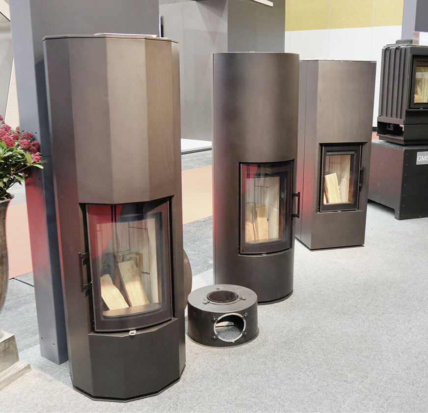 Der bekannte Keramikhersteller aus Gundelfingen im Breisgau zeigte in Wels neue Strukturkacheln im Format 22 x 22 cm sowie mit den Mustern korrespondierende Plattsimse. Diese waren auch an vollständig aufgebauten Feuerstätten zu sehen. Interessant fanden wir auch den Säulenofen „e-Konzept“. Das Prinzip ist zwar nicht neu, aber der mit Strom betriebene Speicherofen bringt schon bei geringen elektrischen Leistungswerten angenehme Strahlungswärme ins Haus – auch dort, wo ein klassischer Holzofen nicht installiert werden kann. Emissionsfrei und mit allem Komfort wie einer Temperatur- und/oder Zeitsteuerung. Und er ist dabei trotzdem ein Stück echte Handwerksarbeit. Einer der Gutbrod-Mitarbeiter hat seit Jahren ein ähnliches Modell bei sich in Betrieb und schwärmt von „vier Stunden Wärme für 1,50 Euro an Stromkosten, selbst bei den aktuellen Tarifen“.