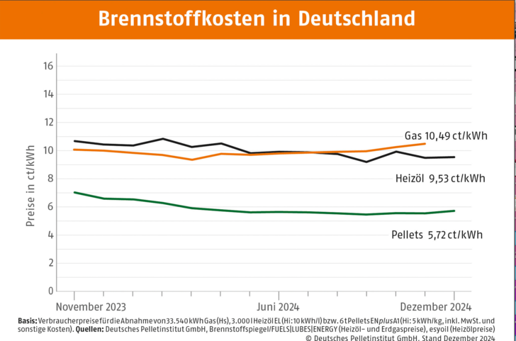 Im Dezember 2024 ergeben sich beim Pelletpreis folgende regionale Unterschiede (bei einer Abnahmemenge von 6 Tonnen): In Süddeutschland liegt der Preis bei 280,37 Euro/t, gefolgt von Mitteldeutschland mit einem Durchschnittspreis von 284,09 Euro/t. In Nord- und Ostdeutschland beträgt der Preis pro Tonne 298,81 Euro.