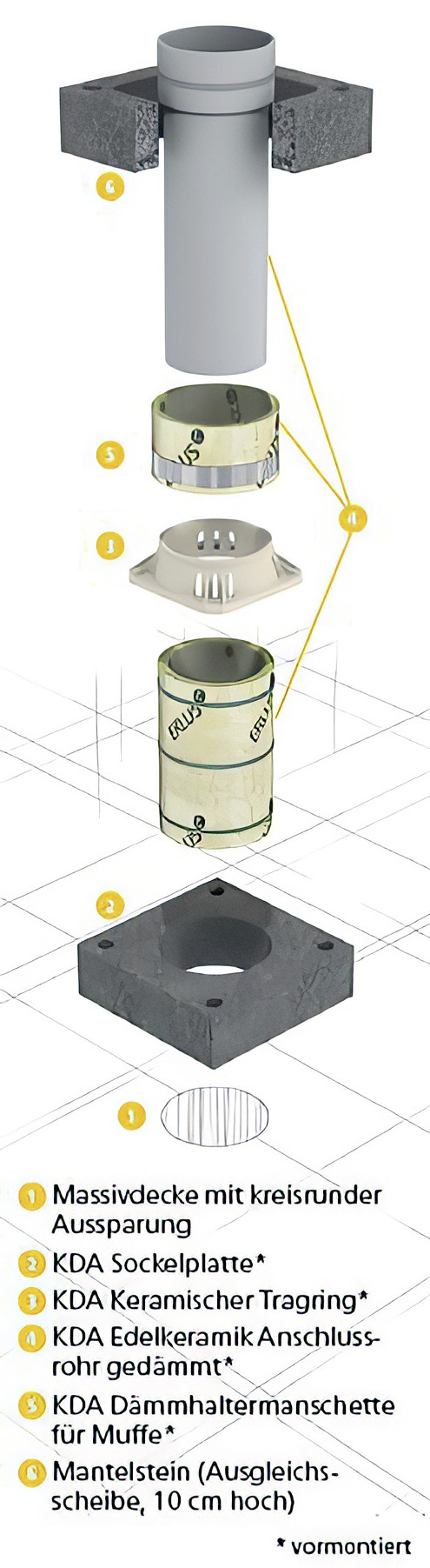 Der keramische Deckenanschluss „KDA“ eröffnet neue Freiheiten im Ofenbau. Er ermöglicht eine filigrane Rohrverbindung vom Ofen in die Decke. Egal ob der Kunde einen Kaminofen, Designkamin oder Kachelofen wünscht, der „KDA“ unterstützt die Ofenbauweise. Dadurch gewinnt man rund um den Ofen Platz, da der Schornstein erst in der Decke darüber beginnt und somit keine Wand im Bereich des Ofens erforderlich ist. Der „KDA“ schafft damit Platz für kreative Ofenträume und völlig neue Gestaltungs- und Einsatzmöglichkeiten. Der Deckenanschluss ist mit einem Durchmesser von 16, 18, 20 und 25 Zentimeter erhältlich. Gemäß seiner bauaufsichtlichen Zulassung Z-7.4-3514 in der auch die Einbaukriterien und Voraussetzungen beschrieben werden, wird er anstelle der Fußausbildung auf eine kreisrunde Öffnung in der tragfähigen und nicht brennbaren massiven Geschossdecke gesetzt. Der „KDA“ darf ausschließlich vom Fachmann eingebaut werden und setzt eine geeignete Feuerstätte voraus. Beides muss bereits während der Planung mit dem örtlichen bevollmächtigten Bezirksschornstein-
