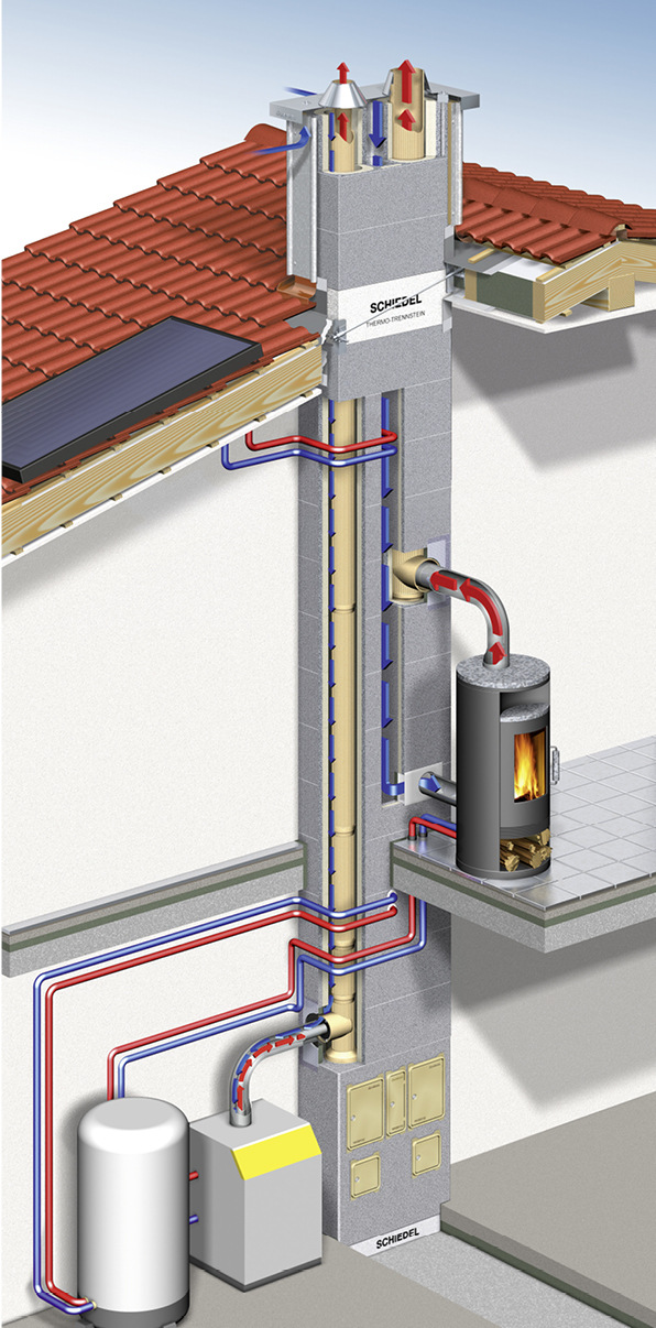 Der „Absolut“ ist ein modernes, zweischaliges Schornsteinsystem bestehend aus einem Compound-Mantelstein aus Leichtbeton mit bereits werkseitig integrierter Schaumbeton-Wärmedämmung und einem hochdichtem Profil-Keramikrohr. Der „Absolut“ besitzt die W3G-Zulassung und ist für alle Brennstoffe geeignet und prädestiniert für den Betrieb von kondensierenden Pellet-Feuerstätten. Ein Kamin- oder Kachelofen benötigt zum sicheren Betrieb ausreichend Verbrennungsluft. Diese führt der „Absolut“ als LAS-System (Luft-Abgas-Schornstein) über den ebenfalls gedämmten Thermo-Luftzug von außen direkt zur Feuerstätte und vermeidet somit eine Kaltader im Haus. Die aufeinander abgestimmten Bauteile und Thermo-Elemente garantieren eine Blower-Door-sichere Ausführung. Langlebigkeit und Zuverlässigkeit sind wichtige Anforderungen. Daher gewährt Schiedel 30 Jahre Funktionsgarantie auf den „Absolut“. Das System wurde überdies vom Sentinel Haus Institut (SHI) auf Schadstoffe geprüft und wird als „wohngesund“ empfohlen.