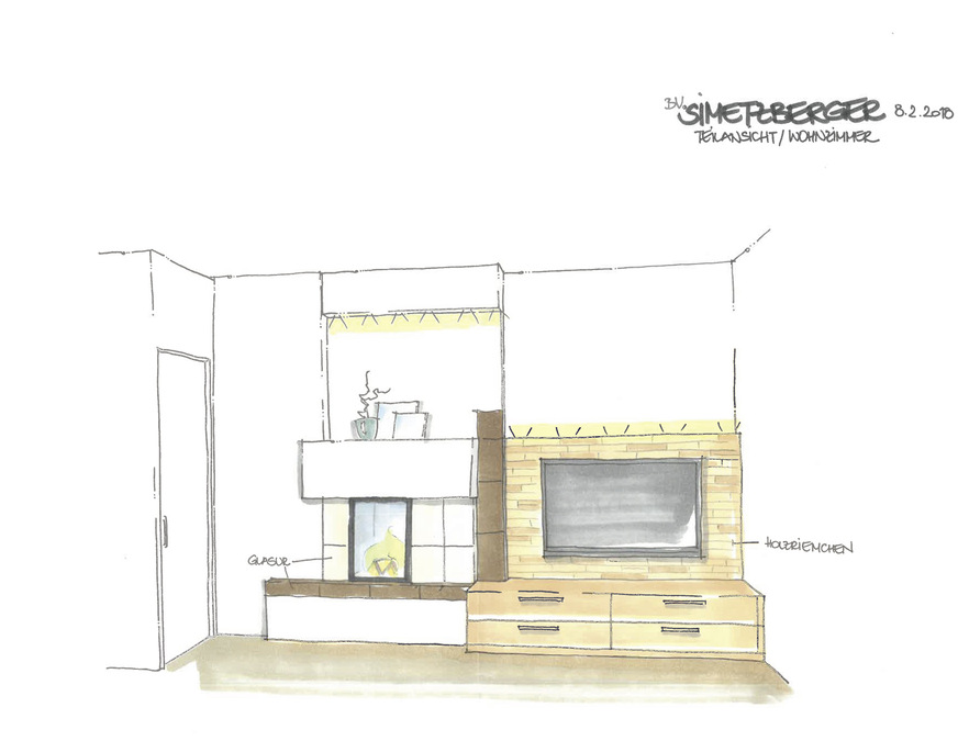 Barbara und Andreas: Die Raumplanung hatten wir grundsätzlich selbst gemacht und von Anfang an war ein Ofen als Raumteiler geplant. Ziemlich bald kam dann auch die Entscheidung mit Ofenbank als Esstisch-Bank. Die äußere Gestaltung ist dann hauptsächlich mit Martin Kummer entstanden. Vorher haben wir online ein bisschen gestöbert, was uns gefällt. Zuerst wollten wir einen querformatigen Feuerraum. Im ersten Entwurf von Martin Kummer war dann zwar ein hochformatiger Feuerraum, aber er hat uns mit seiner tollen Planung überzeugt.