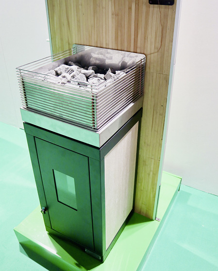 Bei Tulikivi wird die Wärme traditionell in Speckstein gespeichert. Zu den Ausstellungsstücken zählte unter anderem der Tunnelkamin „Raita Trio 18 2D“ mit massivem Specksteinkorpus als Wärmespeicher. Ähnlich schlicht, aber zur Wandaufstellung vorgesehen, sind die beiden Öfen „Hari 18“ und „Hari 14“.