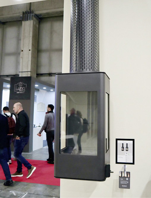 Brunner präsentierte sich auf der Progetto Fuoco ziemlich ungewohnt – nicht in bayerischer Blockhüttentradition, sondern stylisch-modern in einem reduziert gestalteten Kubus. Im Mittelpunkt stand beziehungsweise hing ein freier, vierseitig offener „Urfeuer 4free“-Kamin, und am Kopfende unter dem prominenten Schriftzug „green“ drei verschiedene BKH-Kaminausführungen mit der Ultra-Low-Emissionstechnologie, die diese zukunftsweisende Produktlinie auszeichnet. Außen seitlich am den Kubus waren die urigen Gussöfen „iron dog“ ausgestellt.