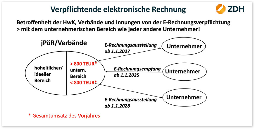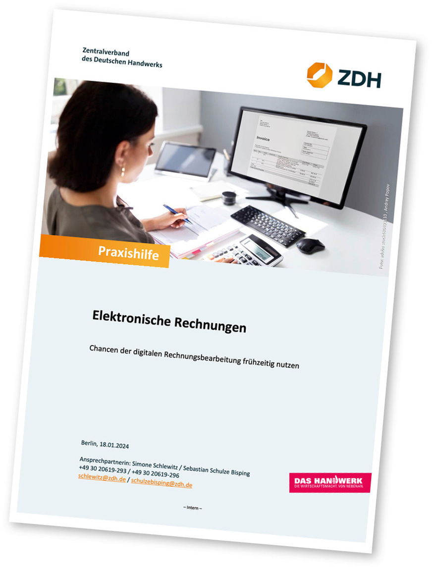 Die Handwerkskammer Rheinhessen hat im Mai 2024 unter folgendem Link eine Umfrage unter Handwerksbetrieben zur E-Rechnung gestartet (https://www.hwk.de/umfrage-sind-handwerksbetriebe-bereit-fuer-die-verpf…). Dort ist auch eine Broschüre „Praxishilfe: Elektronische Rechnungen“ des Zentralverbands des Deutschen Handwerks (ZDH) eingebunden, die sich online lesen, aber auch herunterladen lässt.