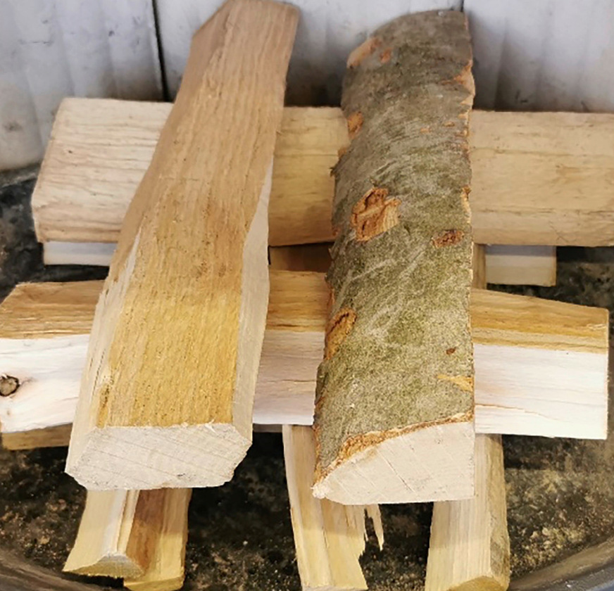 Abbildung 1 zeigt beispielhaft für Ofen 4 die Anordnung der Holzscheite im Ofen vor dem Anzünden. Dabei wurden stets etwas dickere, aber auch kleinere Scheite verwendet sowie ein in wachsgetränkter Holzwolle-Anzünder. Die Masse der größeren Scheite entsprach der Brennstoffmasse bei Nennlast und zusätzlich wurden ca. 25 % dieser Masse noch zusätzlich an feinem Anzündholz verwendet.
