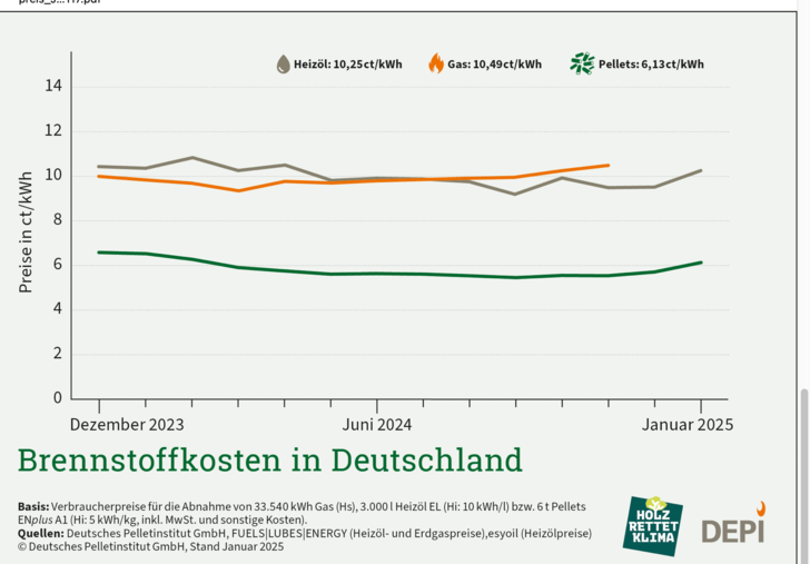 Das Jahr beginnt für alle Pelletheizer sehr erfreulich: Der Preisanstieg im Januar ist bisher nicht ungewöhnlich stark und entspricht einer normalen Entwicklung im Winter. Die Pelletbranche ist für eine gesteigerte Nachfrage bestens gerüstet, sollte es doch noch mal knackig kalt werden“, erklärt DEPI-Geschäftsführer Martin Bentele. „Der Preis für Holzpellets hat sich im vergangenen Jahr wieder auf einem moderaten, sozialverträglichen Niveau eingependelt“, so Bentele weiter. „Auch das sind gute Nachrichten für Pelletkunden. Denn im Vergleich zu anderen Heizarten waren und sind Holzpellets deutlich kostengünstiger.“