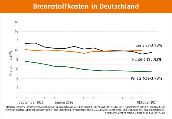 Im Oktober 2024 ergaben sich beim Pelletpreis folgende regionale Unterschiede (bei einer Abnahmemenge von 6 Tonnen): In Süddeutschland liegt der Preis bei 273,49 Euro/t, gefolgt von Mitteldeutschland mit einem Durchschnittspreis von 278,87 Euro/t. In Nord- und Ostdeutschland beträgt der Preis pro Tonne 284,73 Euro. Größere Mengen (26 t) wurden im Oktober 2024 zu folgenden Konditionen gehandelt: Süd: 258,60 Euro/t, Mitte: 263,98 Euro/t und Nord/Ost: 265,27 Euro/t (alle Preise inkl. Mehrwertsteuer).