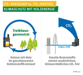Eine neue Grafik der Fachagentur Nachwachsende Rohstoffe e. V. (FNR) verdeutlicht den klimafreundlichen Kreislauf: Bäume nutzen beim Wachsen u. a. Sonnenenergie und Kohlendioxid (CO2) und speichern Kohlenstoff und Energie im Holz. Beim Heizen mit Holz wird die gespeicherte Sonnenenergie als Nutzenergie in Form von Wärme wieder frei; der Kohlenstoff geht als CO2 zurück in die Atmosphäre. Dabei wird nur so viel CO2 frei, wie der Baum im Wachstum als Kohlenstoff im Holz gespeichert hat. Zeitgleich heranwachsende Bäume gleichen die Emissionen wieder aus, denn sie binden Kohlendioxid aus der Atmosphäre.