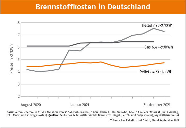 Beim Preis für Holzpellets ergeben sich im September 2021 regional folgende Unterschiede (Abnahmemenge 6 t): In Mitteldeutschland sind Pellets mit 232,84 Euro/t wie schon im Vormonat am günstigsten. In Süddeutschland liegt der durchschnittliche Tonnenpreis bei 236,49 Euro, in Nord-/Ostdeutschland bei 238,37 Euro.