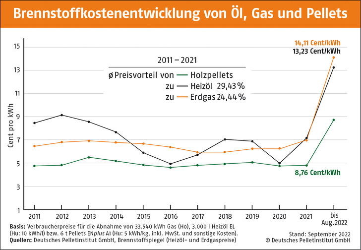 Beim Pelletpreis ergeben sich im September 2022 regional folgende Unterschiede (Abnahme 6 t): In Süddeutschland liegt der Preis für Pellets bei durchschnittlich 741,26 Euro/t, in der Region Mitte bei 771,79 Euro/t. In Nord-/Ostdeutschland beträgt der Pelletpreis 794,00 Euro/t.