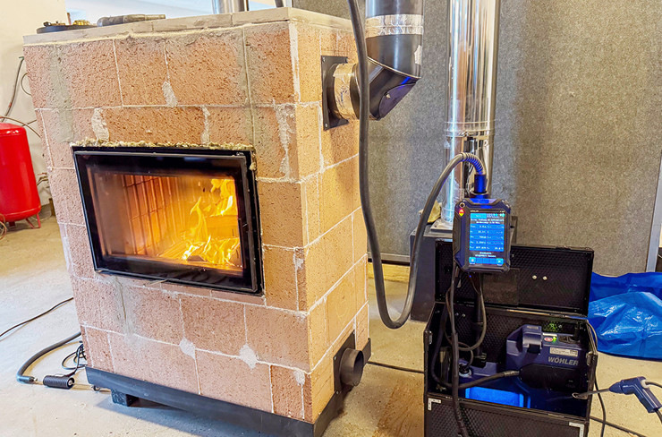 Mess- und Prüfanordnung an einem Speicherofen. Nach Nivellierung und kurzer 3-minütiger Vorlaufphase startet die Messung mit 30 Minuten Dauer. Wichtig: verstellt werden (z.B. der Luftschieber) darf während des Vorlaufs und des Messzeitraums nichts mehr.