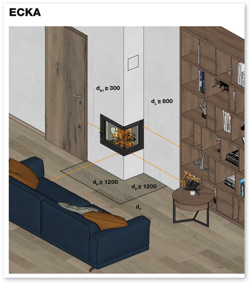 dF: Mindestabstand zu brennbaren Materialien – es ist zulässig, den brennbaren Boden mit dem entsprechenden Brandschutz direkt an die Hülle zu bauen (Abstand 0), falls der Kamineinsatz mit Standardfüßen ohne Versenkung auf dem Boden steht (dB Abstand unter der Feuerstätte = 0).