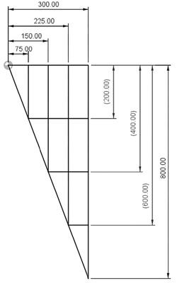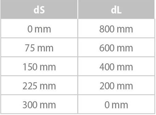 Auf der Skizze des Hoxter Eckgeräts ist zum Beispiel ein Abstand dL von 800 mm zum Bücherregal angegeben. In diesem Fall ist der Einsatz bündig an die Wand angebaut, das heißt, der Wert von dS liegt bei 0 mm. Wäre das Bücherregal nach hinten versetzt (der Wert von dS ist größer als 0), würde der Wert von 800 mm entsprechend reduziert – bis auf 0 mm bei einer Versetzung von 300 mm oder mehr (Wert dS). Die gegenseitige Abhängigkeit der Werte dL und dS zeigt das Dreieck in Schema 1 und die dazugehörige Tabelle (gültig für die Geräte von Hoxter).