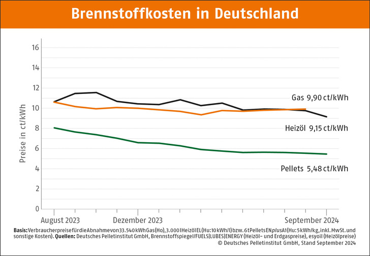 Im September 2024 ergeben sich beim Pelletpreis folgende regionale Unterschiede (bei einer Abnahmemenge von 6 Tonnen): In Nord- und Ostdeutschland liegt der Preis bei 265,57 Euro/t, gefolgt von Süddeutschland mit einem Durchschnittspreis von 272,44 Euro/t. Mitteldeutschland beträgt der Preis pro Tonne 272,59 Euro.