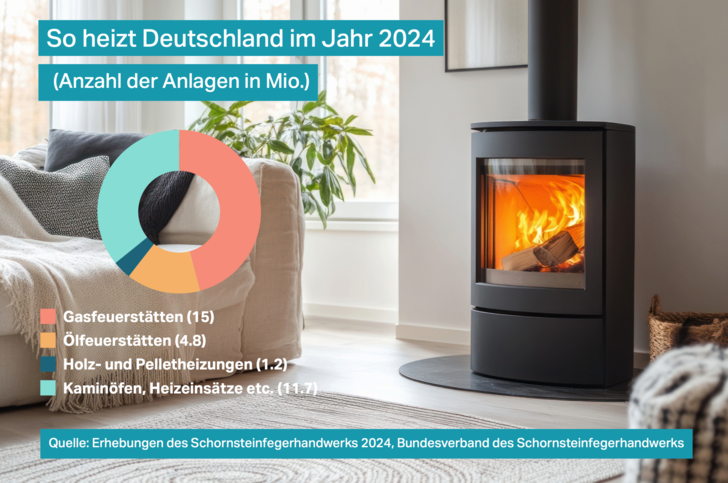 Auch die Anzahl der klimafreundlichen Biomasseheizungen veränderte sich nur wenig. In der Kategorie „Heizkessel für feste Brennstoffe“ ergaben die Erhebungen des Schornsteinfegerhandwerks im Jahr 2024 einen leichten Anstieg auf fast 1,16 Millionen Anlagen. Es handelt sich hierbei um Zentralheizungen, die mit fester Biomasse wie Pellets, Hackschnitzel oder Scheitholz betrieben werden. Die Zahl der Einzelraumfeuerungsanlagen blieb nahezu konstant bei 11,73 Millionen und damit in etwa auf Vorjahresniveau. Zu den Einzelraumfeuerstätten zählen Kamin-, Kachelöfen oder Heizeinsätze, die in der Regel nur den Aufstellraum beheizen, nicht aber an ein zentrales Wärmeleitungsnetz angeschlossen sind. Im aktuellen Gebäudeenergiegesetz wurden bestimmte Biomasseanlagen als Erfüllungsoption aufgenommen und können als erneuerbare Energie angerechnet werden. Vor allem im ländlichen Bereich könnten Biomasseanlagen, auch als kombinierte Hybridlösungen, eine Option sein.