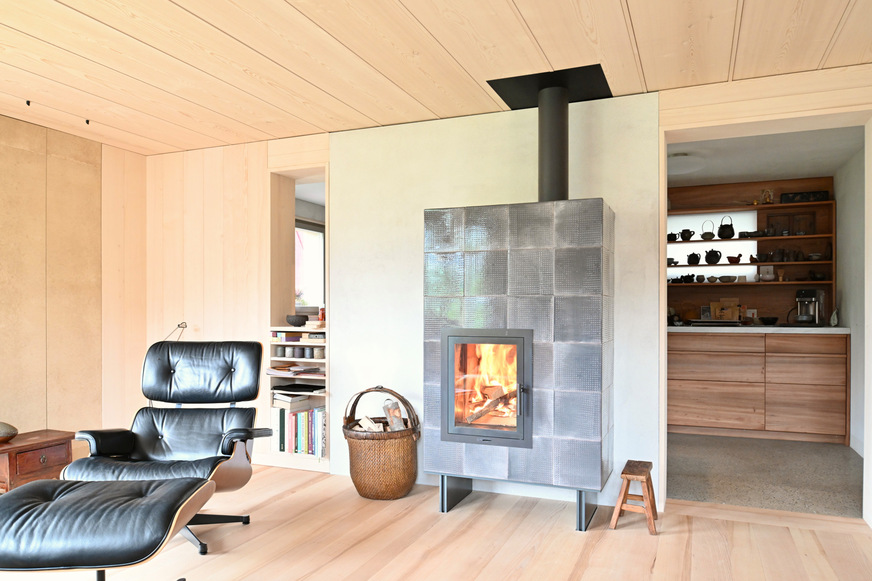 Der moderne Speicherofen von Otto Gschwend mit grünen 3D-Fliesen, Glasfront und Holzregal verbindet Eleganz und Funktionalität. Er trennt Wohnbereiche, integriert geschickt den Schornstein und ergänzt den Raum mit einer frei auskragenden Holzbank.