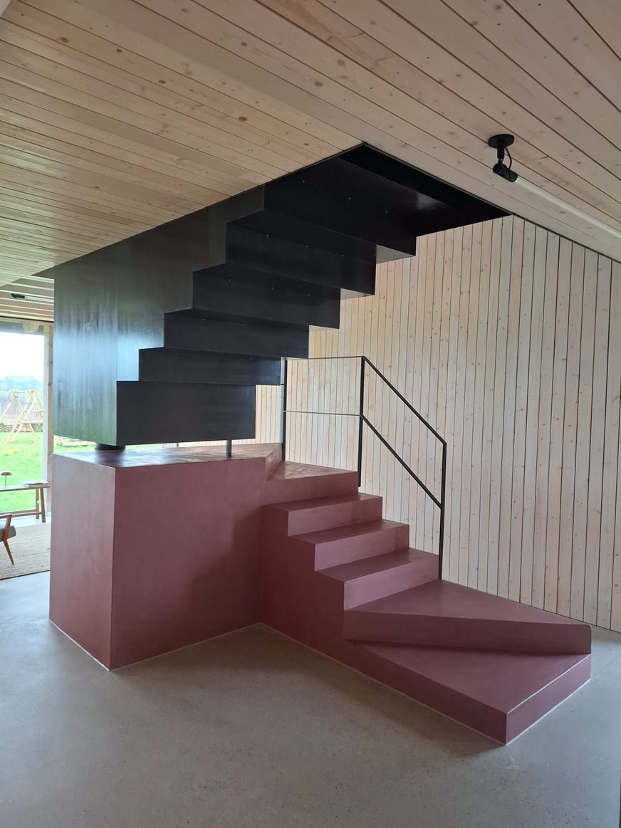 Eine massive Beton- und Stahltreppe vereint Kunst und Funktion: Als skulpturales Zentrum eines Architektenhauses verbindet die freistehende Konstruktion von Günther Seyrlehner nicht nur Etagen, sondern integriert auch einen Kamin. Präzises Handwerk trifft auf innovative Wärmetechnik.