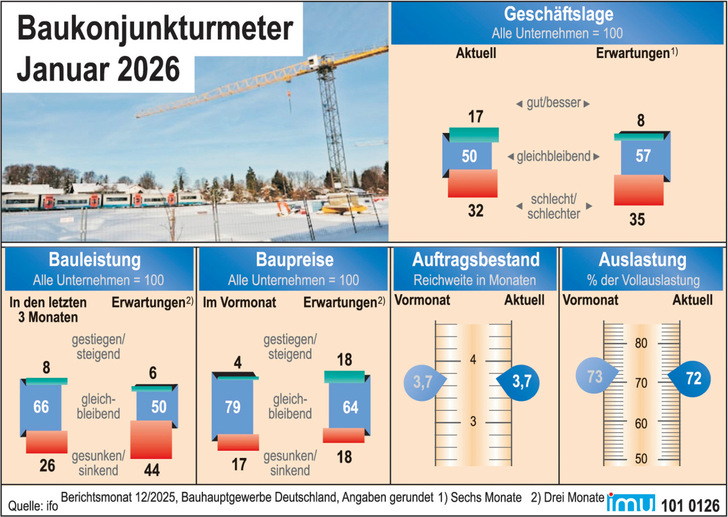 Die deutsche Bauwirtschaft rutscht zum Jahreswechsel 2025/2026 in den Winter. Wie die jüngste Umfrage des ifo-Instituts zeigt, beurteilten die Unternehmen des Bauhauptgewerbes im Dezember 2025 sowohl ihre aktuelle Geschäftslage als auch die Entwicklung der Bautätigkeit negativer als im November 2025. Allerdings deutlich besser als vor einem Jahr. Und: Die Erwartungen für die Geschäftslage in den nächsten sechs Monaten legte schon wieder zu.