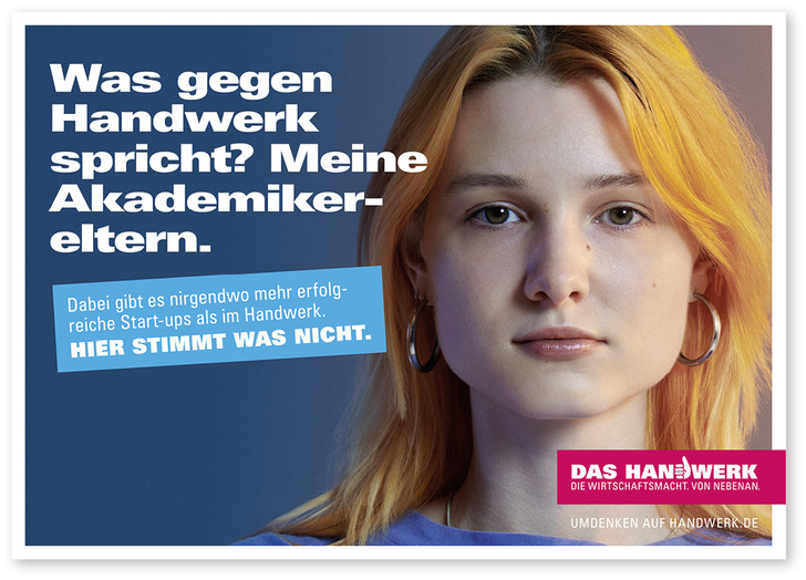 Vor diesem Hintergrund startete das Handwerk die zweite Werbewelle („Flight“) der Imagekampagne in diesem Jahr. Die Aktion unter dem Motto „Hier stimmt was nicht.“ will bewusst Vorurteile hinterfragen und auf diese Weise zum Nachdenken anregen. Mit Headlines wie „Wieso zähle ich weniger, wenn ich mehr will als Powerpoint?“ oder „Was gegen Handwerk spricht? Meine Akademikereltern.“ werben die Anzeigenmotive für mehr gesellschaftliche Anerkennung von Handwerksberufen – insbesondere bei Jugendlichen, Eltern und Lehrern – und für eine Gleichwertigkeit von akademischer und beruflicher Bildung.