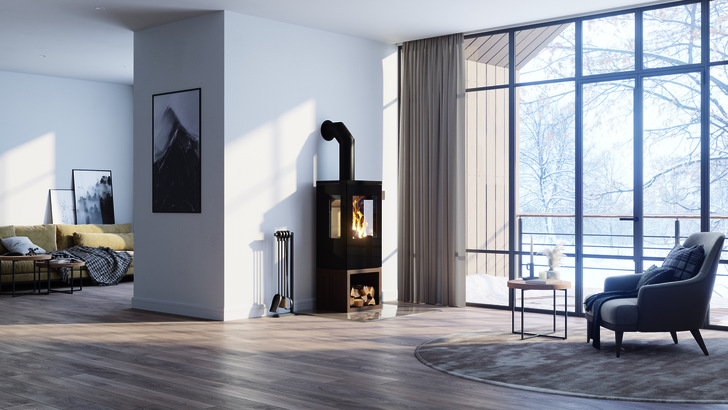 Das Ergebnis kann sich sehen lassen. Der „Galileo“ bietet eine 3-seitige Verglasung für ein beeindruckendes Feuerschauspiel. Dabei sind sowohl vorne als auch an den Seiten die Glasscheiben großflächig schwarz bedruckt – das verleiht dieser Feuerstätte sein ganz eigenes Erscheinungsbild. Die Seitenscheiben sind darüber hinaus doppelverglast. Hierdurch wird eine höhere Feuerraumtemperatur erreicht; für einen effizienten Abbrand und natürlich auch für länger saubere Glasscheiben.