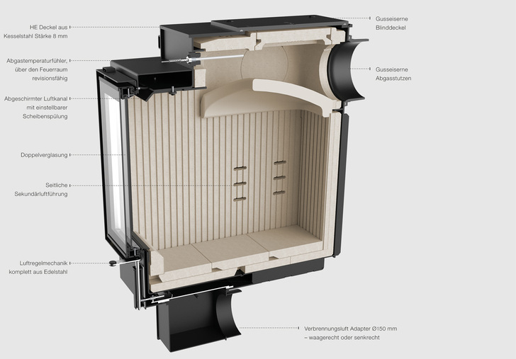 Alle mechanischen Teile sind auch nach dem Einbau über den Feuerraum zugänglich. Die Nachbrennkammer ist separat oberhalb der Feuerraumauskleidung verbaut. Der herausnehmbare doppelte Boden ermöglicht den Zugang zur Luftregelmechanik, ohne die seitlichen Steine demontieren zu müssen. Ebenso ist der Abgastemperaturfühler der Hoxter-Steuerung über den Feuerraum einfach revisionsfähig.