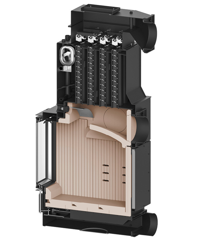 Der Bereich Kamineinsätze bietet ein reiches Angebot an Kesselgeräten an. Es handelt sich im Standardprogramm um Geräte mit Holzauflagenmenge von 2,2 bis 4 Kilogramm pro Stunde und reiner Wasserleistung von 4,5 bis 10 kW je nach Modell. All diese Kamineinsätze sind mit senkrechten Wärmetauschröhren ausgestattet; bei den meisten Geräten ist die Ummantelung ebenfalls im Inneren wasserführend. Alle Front-Kesselgeräte werden standardmäßig mit doppelter Verglasung angeboten. Die Eckgeräte sind seit 13 Jahren mit gebogener einfacher oder doppelter Verglasung wählbar.
