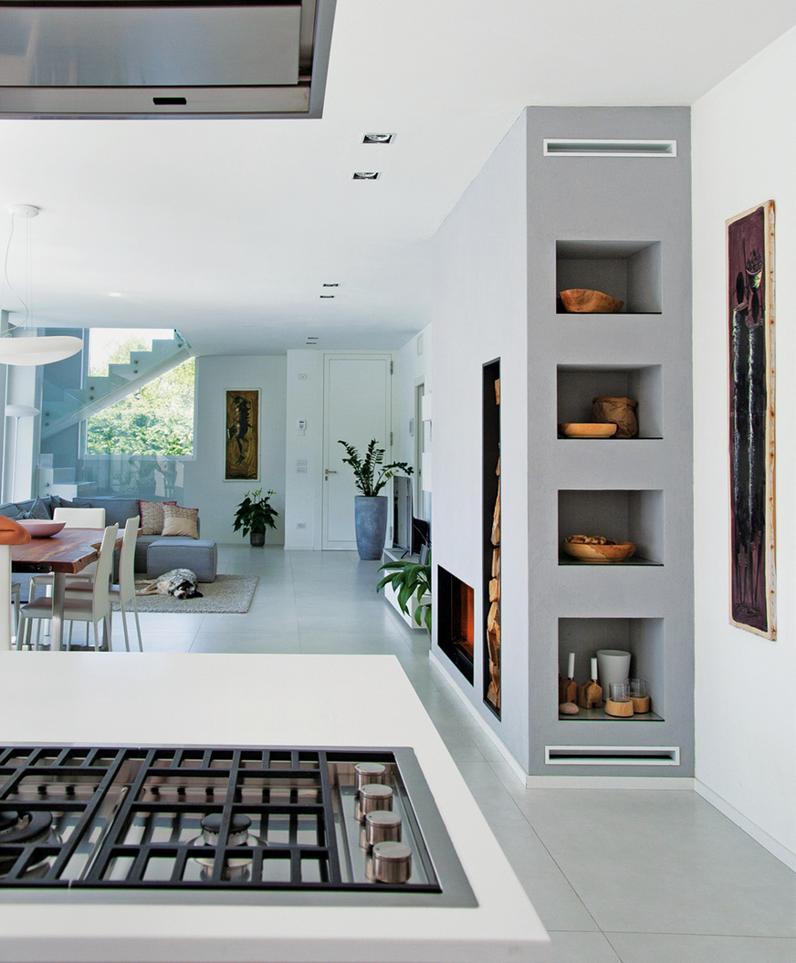 Protagonist des gesamten Erdgeschosses ist der große Kamin „Plasma 115“, der auf Basis natürlicher Konvektion funktioniert. Bei der aus feuerfestem Gipskarton bestehenden Verkleidung boten sich auf der rechten Seite Nischen mit Abstellmöglichkeiten an. Auf der Vorderseite, seitlich vom Kamin, liefert ein mit Metall verkleideter Holzbehälter zusätzlichen Nutzen. Dadurch entsteht ein vertikaler Schnitt, der die Gleichmäßigkeit der Vorderansicht unterbricht und durch die hier gelagerten Holzscheite eine warme Farbe hineinbringt.