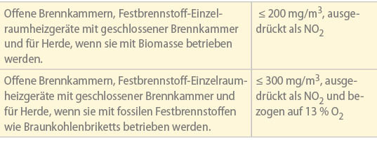 Für die Stickoxid-Emissionen (NOx) von Festbrennstoff-Einzelraumheizgeräten gelten folgende Grenzwerte:
