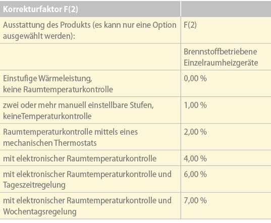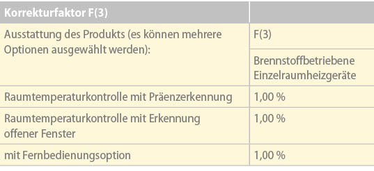Bei allen Einzelraumheizgeräten entspricht der Korrekturfaktor F(2) abhängig von den Eigenschaften der Regelung einem der in Tabelle 4 aufgeführten Werte. Dabei kann nur ein Wert ausgewählt werden.