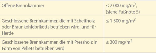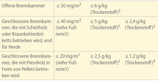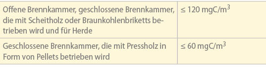 Für die Kohlenmonoxid-Emissionen (CO) von Festbrennstoff-Einzelraumheizgeräten gelten folgende Grenzwerte:
