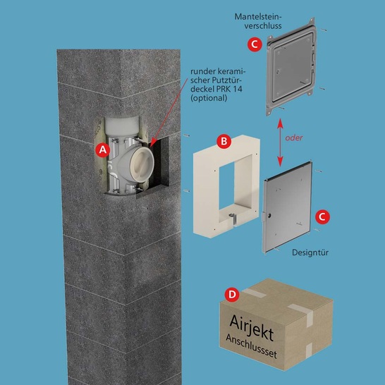 Neu am Airjekt-Anschlussset: Es hat jetzt eine Zarge mit Kabeldurchführung, außerdem kann man zwischen einem Mantelsteinverschluss oder einer Designtüre wählen. Das sieht sauber aus und sorgt schließlich auch für saubere Luft!
