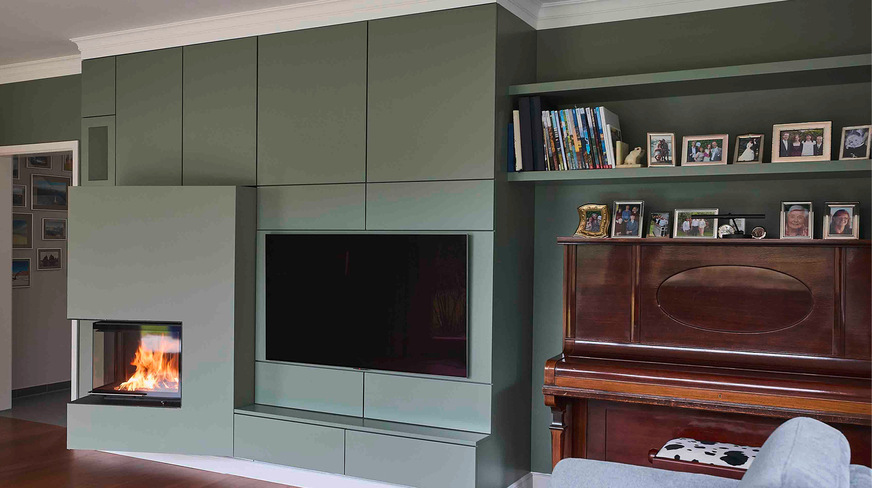 Kamin- und Möbelwand als schicke und funktionale Einheit.«