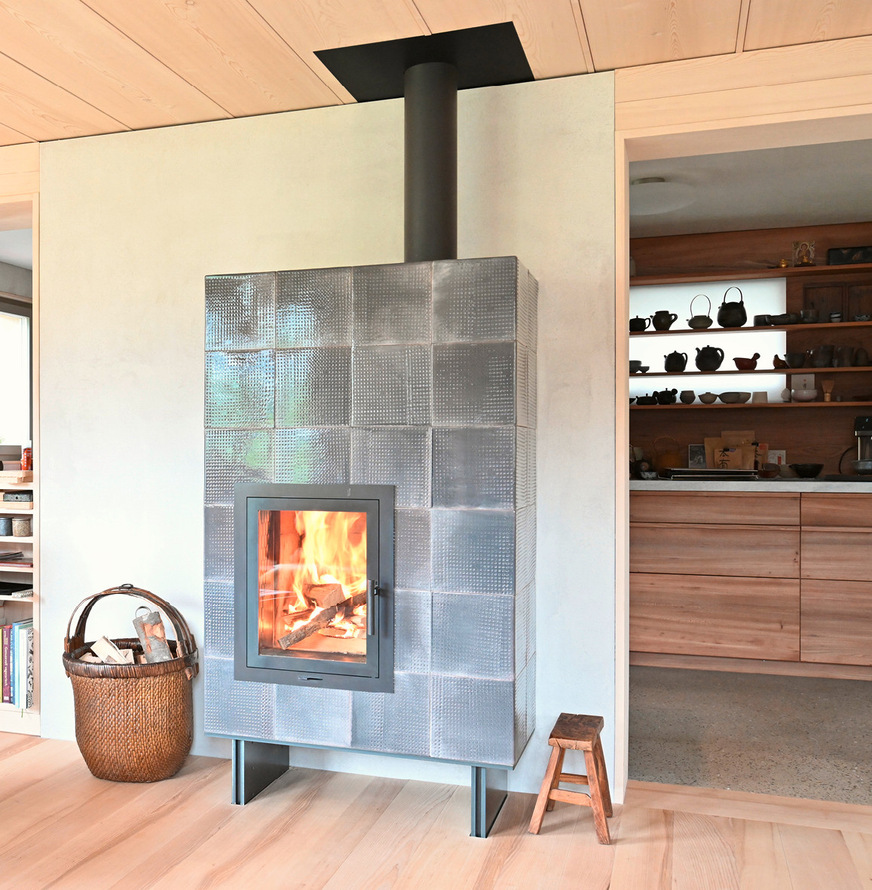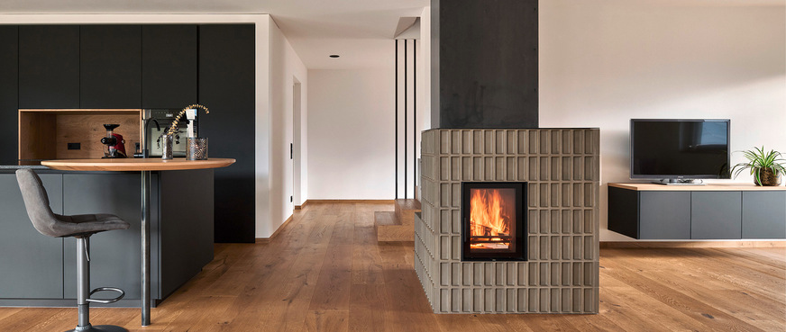 Den Bauherren war es wichtig, den Ofen dreifach zu nutzen: TeTris ist ein stilvolles Möbelstück, das den offen gestalteten Wohnküchenbereich elegant in zwei behagliche Zonen unterteilt und so zum Mittelpunkt einer harmonischen Raumaufteilung wird. Zudem sind zwei separate Feuerstellen in einem einzigen Objekt integriert, die sowohl effizientes Heizen als auch Kochen ermöglichen sollen. TeTris beherbergt eine typische Holzfeuerstätte, die aber nicht nur Wärme spendet, sondern auch als Kochfläche dient. Für die Herdoberfläche wurde geschwärzter Rohstahl gewählt, der eine markante, industrielle Ästhetik mit einer hohen Wärmeleitfähigkeit verbindet. Die Oberfläche des in mehrschaliger Bauweise ausgeführten Speicherofens besteht aus handgeformten, konkaven 3D-Feuerbetonelementen, die sowohl durch ihre optische Wirkung als auch durch ihre hohe Widerstandsfähigkeit und Wärmeeffizienz überzeugen sollen.
