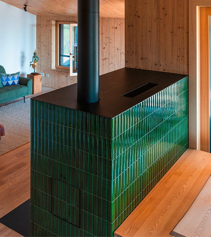 Das Urteil der Jury: Der Speicherofen von Otto Gschwend erinnert an traditionelle Kachelöfen, insbesondere durch die grüne Farbe der 3D-Fliesen, setzt aber im großzügigen Wohnbereich ein deutliches, modernes Statement. Das minimalistische Design und die schlichte Funktionalität machen den Ofen zu einem integralen Teil des Interior Design des Hauses.