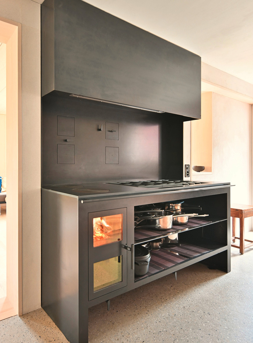 Die Ofenanlage wurde als zentrales Element im Wohnhaus integriert, Kachelofen und Kochherd bilden mit der Wand eine Einheit. Die Feuerstätte übernimmt die Funktion des Wärmespenders und der Kochstelle. So bildet der Küchenblock mit integrierter Gaskochstelle und Dunstabzug (inkl. integrierter Zuluft-Lösung) gleichzeitig auch die Rückwand des Kachelofens. Der Kachelofen kann als Nachheizfläche des Holzkochherdes genutzt werden, um eine Rundumabgabe der Strahlungswärme zu erreichen. Die schlichte Koch-Werkbank ist aus roh belassenem (geölten), warmgewalztem Rohstahl gefertigt. Der in die Wand führende wohnzimmerseitige Kachelofen wurde aus handgefertigten Ofenkacheln erstellt - jede Kachel ist dadurch anders und lässt den Betrachter immer wieder Neues entdecken. Das natürliche Muster in der Profilierung der lederharten Kacheln entstand durch den Herstellungsprozess mit einer über 100-jährigen, handgefeilten Bodenwalze aus Bronze, die einzigartigen Spuren auf den Kacheln hinterlässt.
