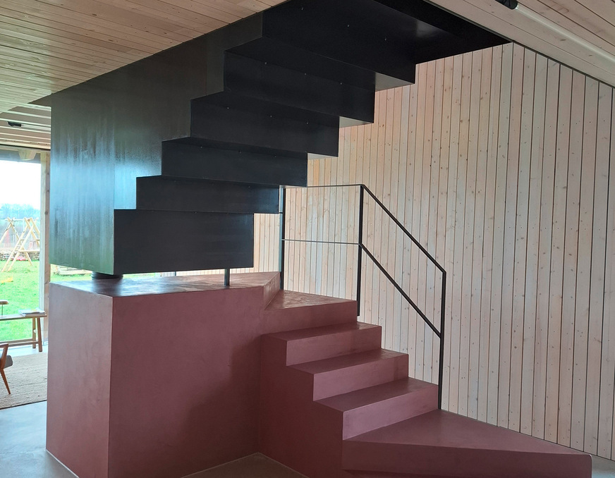 Die offene Gestaltung der Treppenstufen erlaubt es der warmen Luft, frei zu zirkulieren und sich im gesamten Wohnbereich zu verteilen. Treppe und Feuerstätte werden zum zentralen Blickfang und Mittelpunkt des offenen Wohnkonzepts. Sie teilt den Raum auf subtile Weise, ohne ihn zu zerschneiden, und schafft verschiedene Funktionsbereiche, die dennoch miteinander verbunden bleiben.