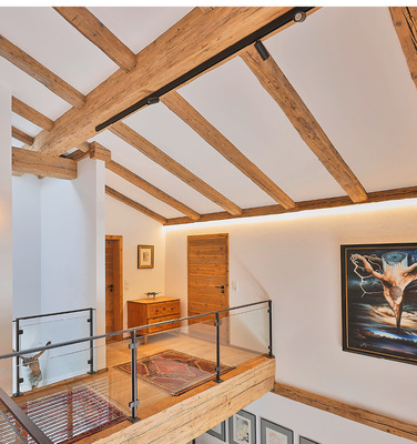 In einem avantgardistischen Architektenhaus dominiert eine massive, hängende Treppe aus Stahl den zentralen Wohnbereich. Dieses imposante Unikat aus zwei in Materialität und Farbe kontrastierenden Konstruktionen ist weit mehr als ein simples Verbindungselement zwischen den Etagen – es ist ein kraftvolles architektonisches Statement, das Funktion und Form auf beeindruckende Weise vereint. Die massive Erscheinung steht im spannenden Kontrast zu dem scheinbar schwebenden Block, der schwer und schwarz von der Raumdecke heruntergreift. Die ersten sieben Stufen aus Beton und der folgende Treppenabsatz aus Stahl scheinen dabei keinerlei Zusammenhalt zu bilden – lediglich ein durch den Spalt gerade noch zu erkennender, wenig verlässlich erscheinender Vierkant stellt eine stabilisierende Verbindung her. Die folgenden Stufen in die erste Etage werden im ersten Obergeschoss verankert. Doch der eigentliche Clou dieser außergewöhnlichen Treppe ist der integrierte Heizeinsatz im unteren Körper der Treppe. Er wurde an der Rückseite nahtlos in die untere Hälfte der Treppenkonstruktion eingebettet. Die massive Konstruktion dient nicht nur als Trägermaterial für die Stufen und den Ofen, sondern fungiert auch als effektiver Wärmespeicher. Die Wärme des Feuers wird aufgenommen und gleichmäßig in den Raum abgegeben, was für eine angenehme und nachhaltige Heizleistung sorgt.
