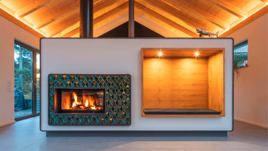 Mit Hoxter-Einsätzen lassen sich stylische Eckkaminlösungen ebenso überzeugend umsetzen wie besonders exklusive Raumteiler mit Kuschel-Koje und Kaufmann Keramik, wie im Bild oben zu sehen,